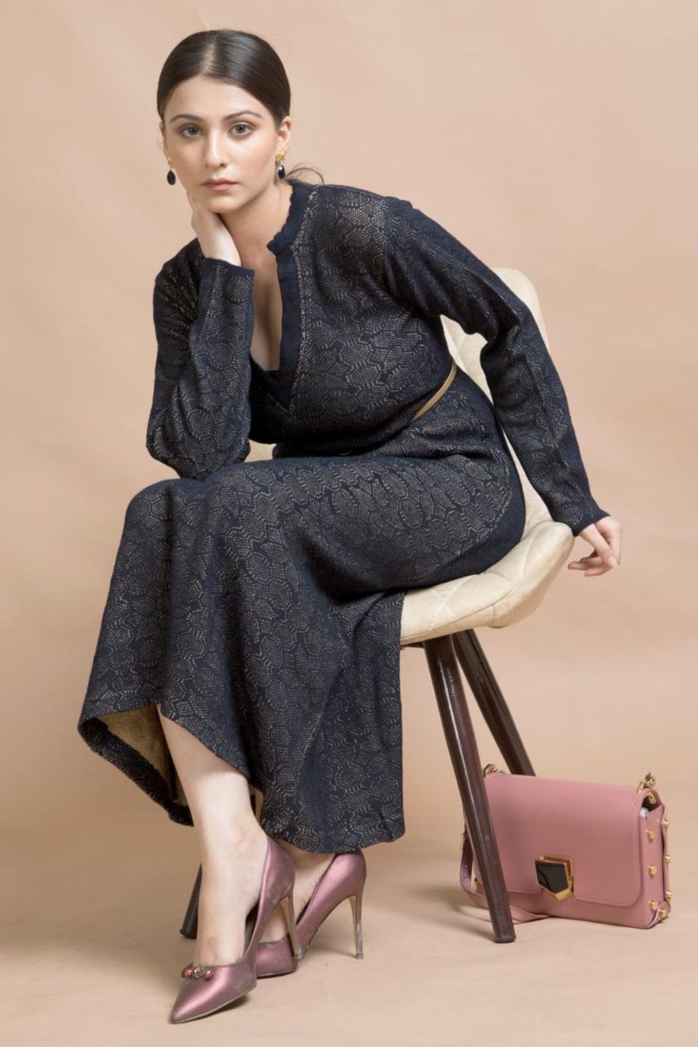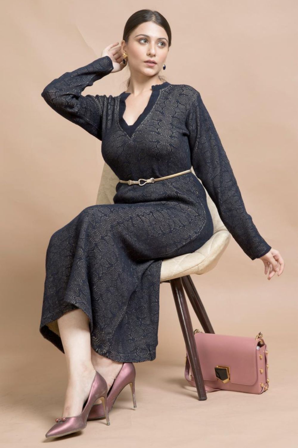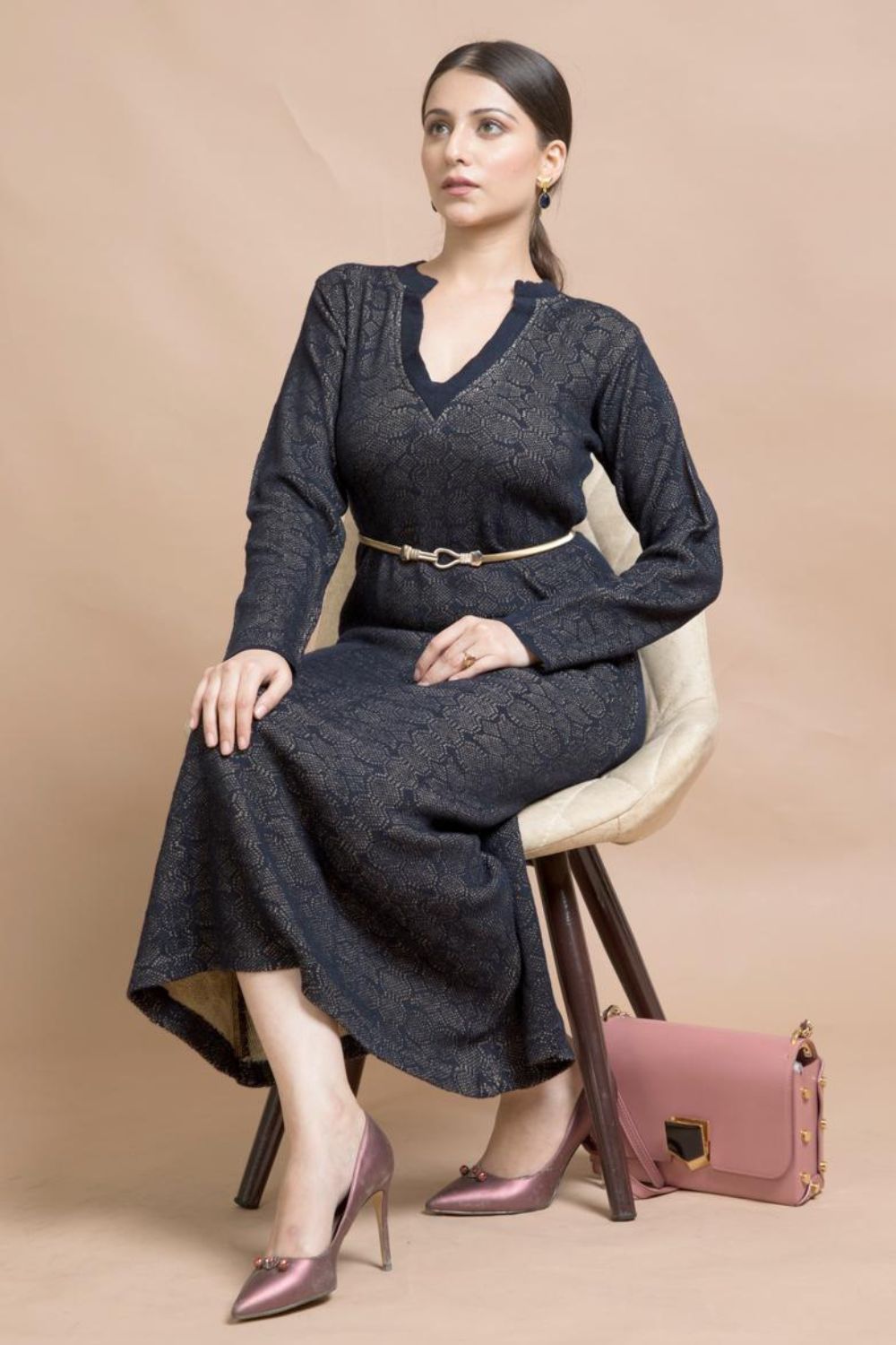Dusk Till Dawn Long Knit Dress in Persian Blue. Elongated V-Neckline with Long Sleeves. Calf Length Dress in a Fine Knit Stretchable Fabric and a Flared Skirt. For The Woman You Are, And The Woman You Want To Be.